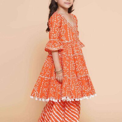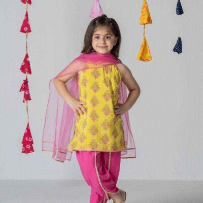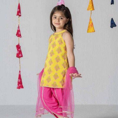 Give your little one the royal treatment with the Royal Riwaaz – Banarasi Beauty Lehenga Set, a majestic blend of traditional prints and regal vibes. This outfit features a stunning navy blue lehenga with intricate multi-color Banarasi-inspired borders, paired with a richly designed aqua and red blouse adorned with zari-style prints.